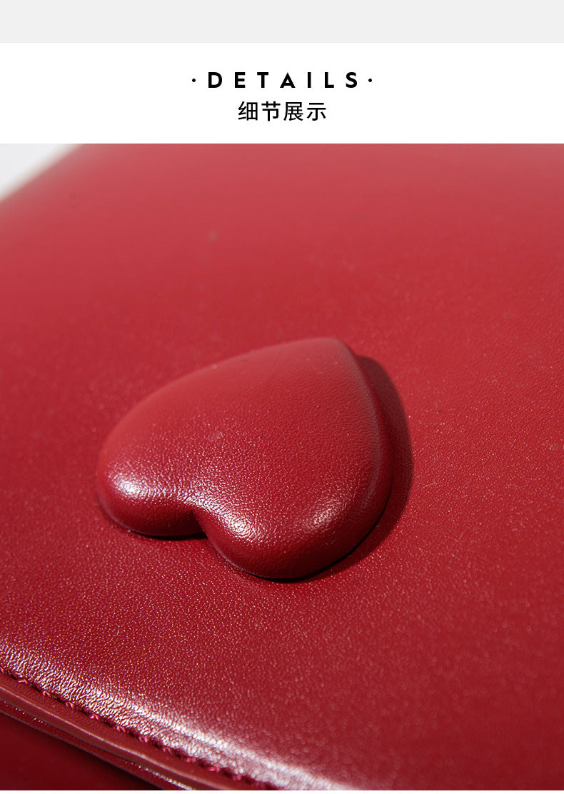 This red handbag is made of leather, with a bright color. The front of the bag is decorated with a three - dimensional heart, adding a sweet and romantic touch. A silk scarf with a red - and - white heart pattern is wrapped around the handle, which not only enriches the visual hierarchy but also gives an exquisite look. Its overall style is fashionable and playful, making it suitable for matching with sweet or casual outfits, and enhancing the charm of the wear.
